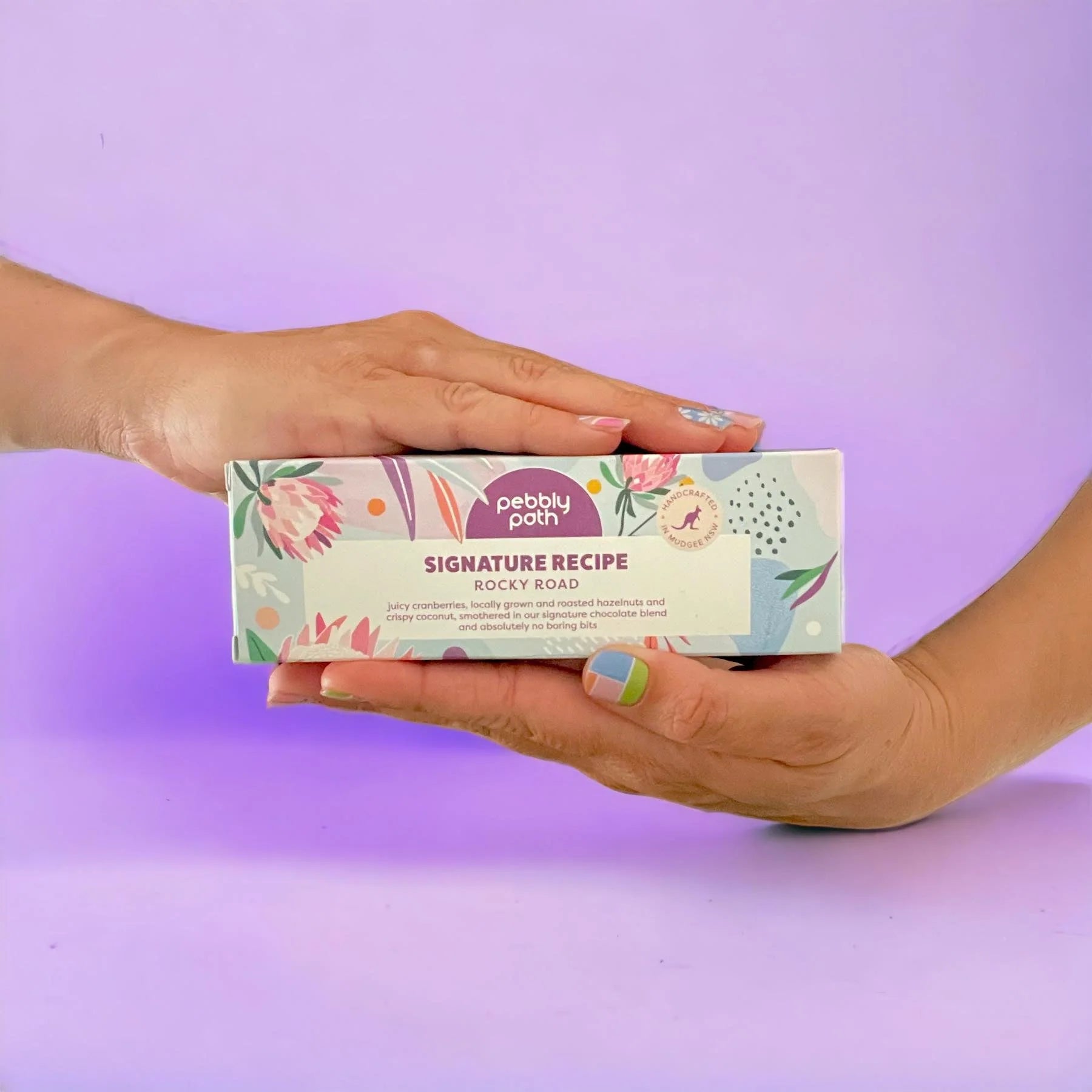 Our decadent signature blend of premium couverture Cadbury chocolate, whole freshly roasted hazelnuts from 'Fourjay Farms' in Oberon, peanuts, whole juicy cranberries, pillowy marshmallow and tasty toasted coconut round out this mouth-watering, timeless treat, that is far superior to any rocky road you've ever had before.