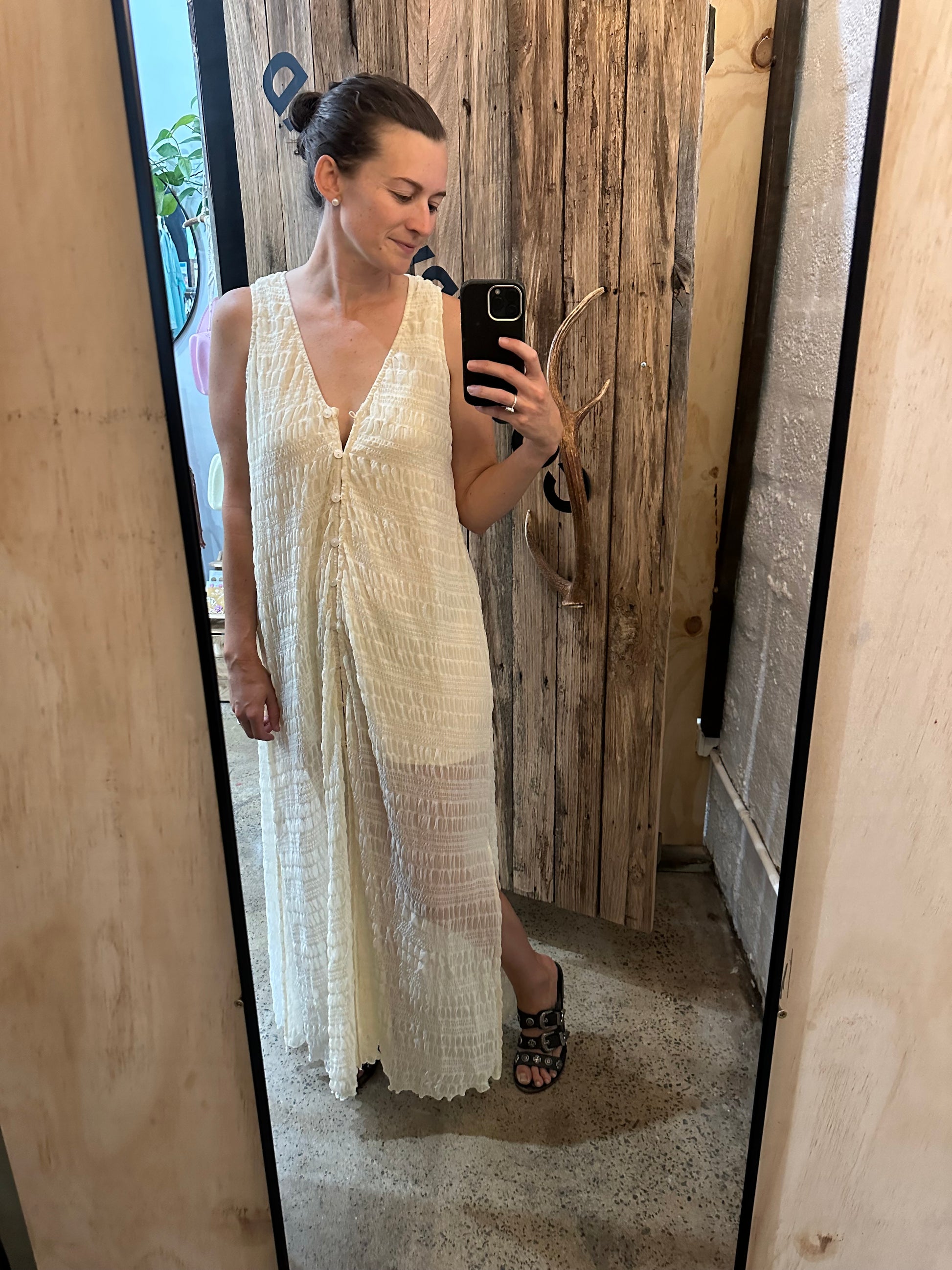 Elegant Cami Maxi Dress: This flowing maxi dress with button details and side slits is perfect for evening celebrations or picture-perfect family photos. It’s light, elegant, and timelessly festive.