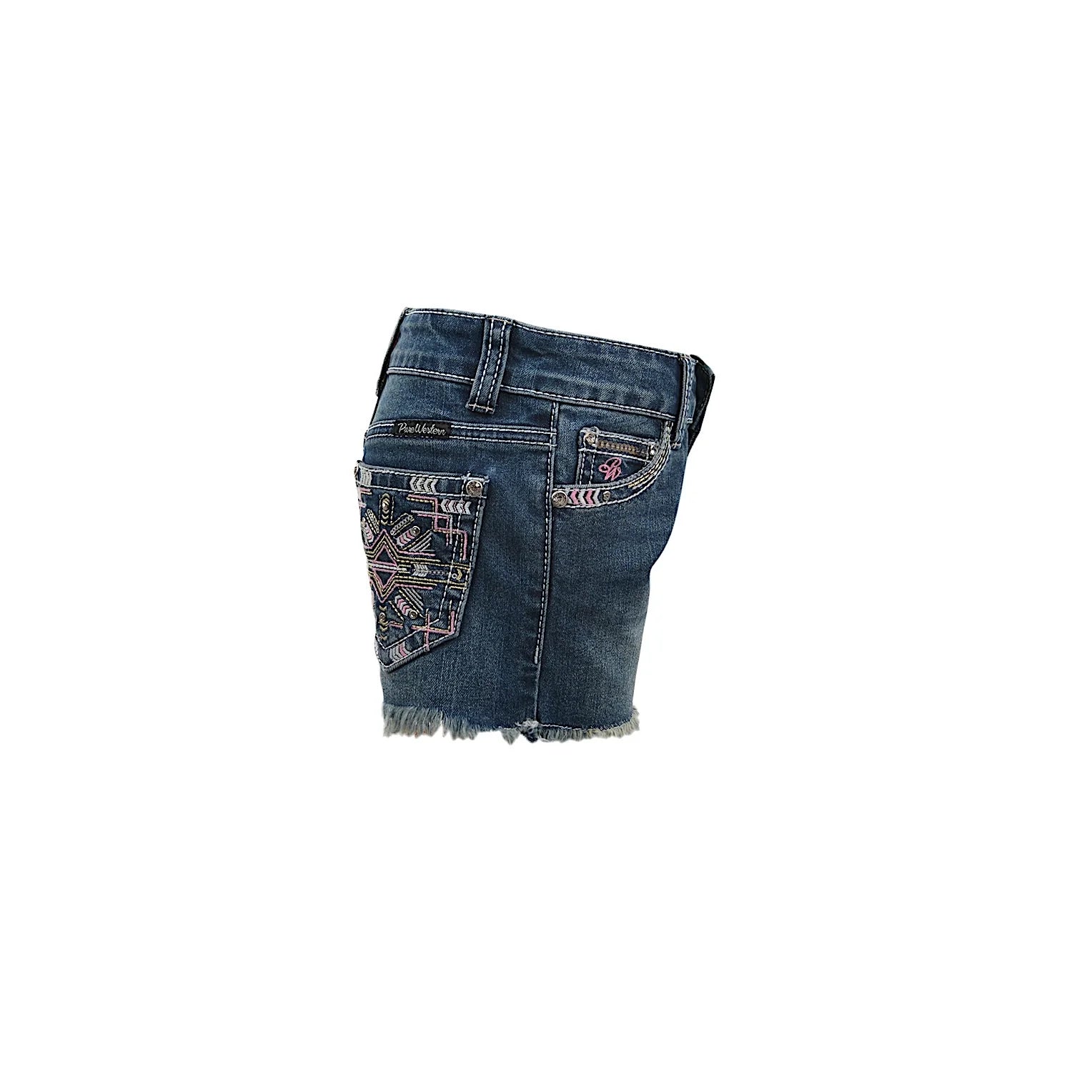 Stretch for comfort, mid rise adjustable elastic waistband on all sizes, logo shank button, diamante rivets, woven logo badge on back yoke, feature embroidery on back pockets and front scoop pockets, PW embroidery on coin pocket, contrast all over topstitch